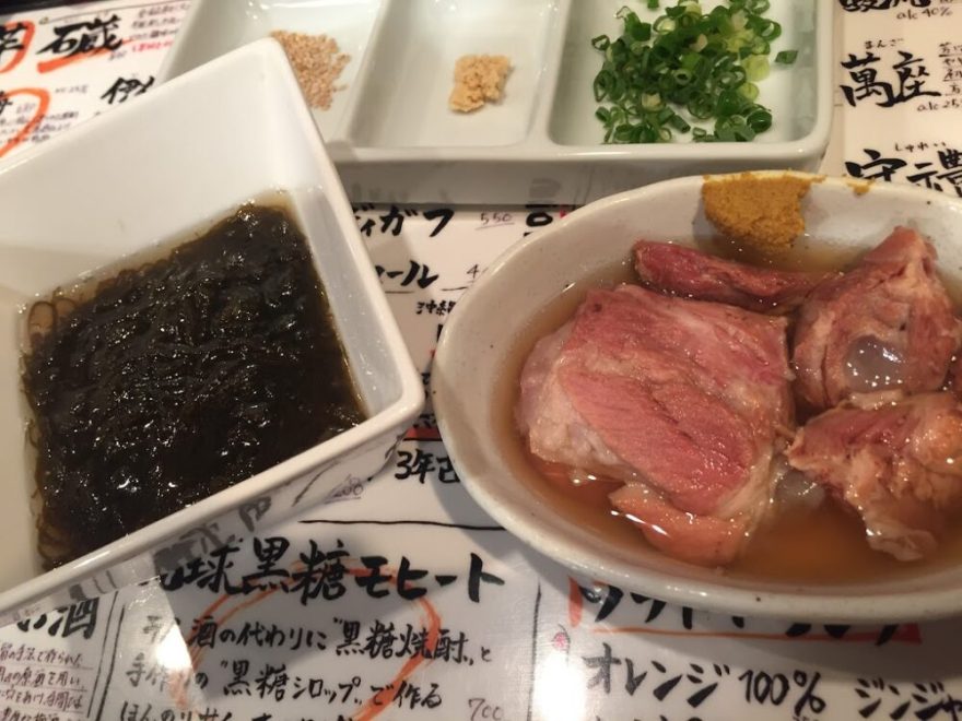 もずくおでんとテビチー(豚足)です。メニューを撮り忘れましたが、200円前後とリーズナブルなお値段でした。味は薄味ですが、お酒のつまみとしてはちょうどよい塩梅でおすすめです。